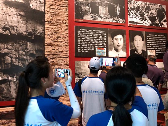 7月7日清晨,大家坐上北上的大巴,前往林州。怀着对红旗渠的向往和对红旗渠精神的崇敬之情,大家首先参观了红旗渠纪念馆,通过实物、音像、图片、模拟场景等形式了解红旗渠建造的全过程。随着讲解员的讲述,大家又重新回顾了那个年代林县人民“千军万马战太行,一锤一钎干革命”的战天斗地革命场景,仿佛看到林县人民苦干10年,仅凭双手和简单工具,硬是从悬崖峭壁上开凿出一条1500公里、灌溉50万亩土地的大型引水灌溉工程的历史画卷,这些英雄事迹强烈地震撼了参与活动师生们的心灵。在馆外的签名墙上,队员们纷纷签上自己的名字。为纪念“七七事变”大家写下“学习红旗渠精神,做新时代大学生——黄河水院实践队2018.07.07”的字样,一方面体现了队员们铭记历史、勿忘国耻的决心,另一方面激励了青年学子树立爱国报国志向的坚定信念。