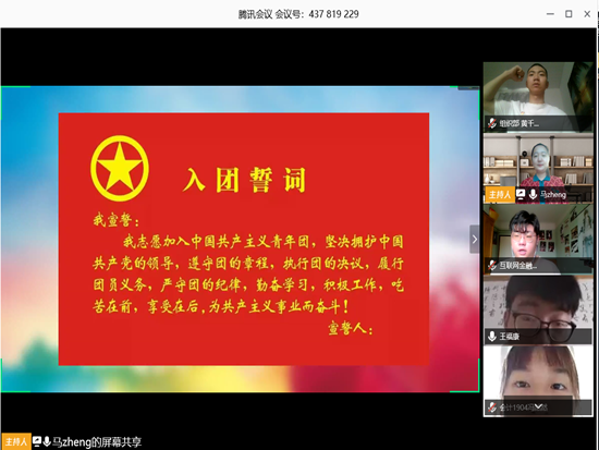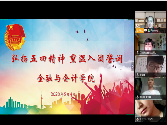 为引导广大青年团员铭记历史,大力弘扬伟大爱国主义精神,2020年5月4日上午,金融与会计学院开展“弘扬五四精神 重温入团誓词”主题线上活动。院学生会主要学生干部及各团支部支委参加活动。活动由院分团委书记马峥主持。