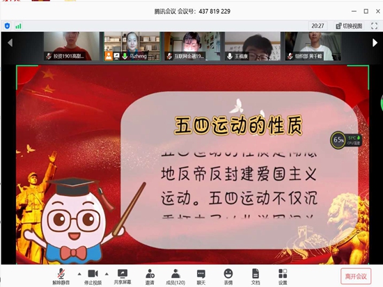 活动伊始,奏唱团歌。与会师生通过网络平台连线,全体起立,齐声高唱共青团团歌。活动第二项,共同观看视频《“五四”运动:中国人的怒吼》,通过视频学习重温五四运动的历史。活动第三项,分团委书记马峥详细讲解了五四运动的性质、五四运动的意义。马峥强调,五四精神薪火相传,在实现中华民族伟大复兴的光辉历程中不断注入新的时代内涵,是推动中国历史和社会进步的重要力量,全体师生比要坚持党的领导,坚定理想信念,大力弘扬爱国主义精神,传承和发扬五四精神,不断的奋斗和创新,为实现中华民族的伟大复兴贡献青春力量。最后,全体与会师生面对屏幕上鲜艳的团旗,举起右拳,用洪亮的声音庄严宣誓,重温入团誓词。