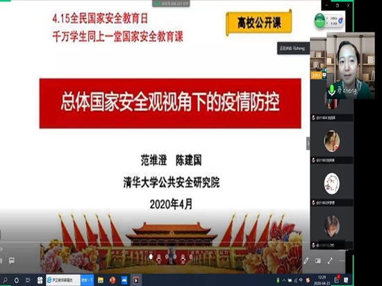 个国家安全教育日,活动主题为“坚持总体国家安全观,统筹传统安全和非传统安全,为决胜全面建成小康社会提供坚强保障”。之后,全体学员在线观看了中国工程院院士、公共安全领域专家范维澄主讲的“总体国家安全观视觉下的疫情防控”公开课,学习了我国总体国家安全体系、现代公共卫生安全面临的挑战风险及其应对政策措施、面对疫情大学生应该如何做等相关知识。最后,学员们积极讨论并表示,会自觉学习国家安全知识,提高责任意识,提升维护国家安全的自觉性和主动性,为维护国家安全贡献出自己的一份力量。
