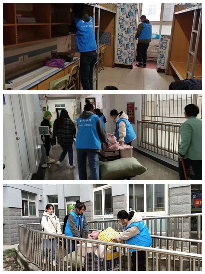 志愿者之间分工明确,一组志愿者在宿舍整理宿舍,帮助18级同学打包行李,打扫宿舍卫生,清运宿舍垃圾,另一组志愿者帮助离校学生搬运行李下楼并运送至学校门口。志愿者们工作认真,不辞辛苦,共参与整理40余间宿舍,帮助215名同学顺利安全离校。