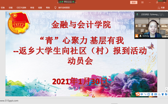 1月30日,金融与会计学院分团委召开“青”心聚力基层有我—返乡大学生向社区(村)报到活动线上动员会,全院各团支部团支四干及学生代表参加会议。分团委书记马峥传达活动精神,组织动员广大返乡大学生落实以城市社区和行政村防控为主的综合防控措施,主动参与到城乡基层防护网络中,在做好自身安全防护的前提下,依法科学有序参与疫情联防联控,积极投入打赢疫情防控战,充分彰显共青团生力军和突击队作用。最后,马峥对参与学生进行安全培训。