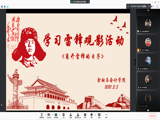 3月5日中午,在第58个学雷锋纪念日到来之际,金融与会计学院开展“青春心向党 志愿新征程” 学雷锋线上观影活动。全院各团支部学生代表参加活动,活动由分团委书记马峥主持。