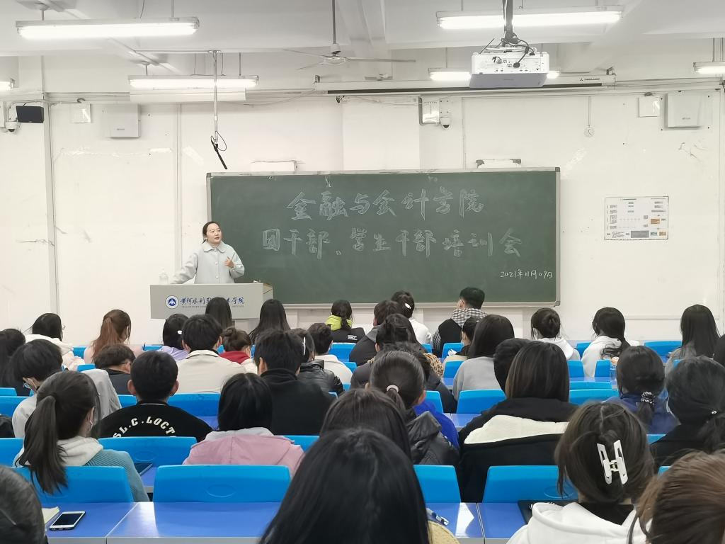 为了进一步加强我院班团干部、学生干部队伍建设,2021年11月9日下午,金融与会计学院分团委在JX2201召开团干部、学生干部培训会,19、20、21级团干部及学生会干部出席会议,会议由分团委书记马峥主持。