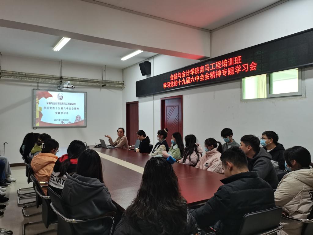 11月30日中午,金融与会计学院分团委在SY5412会议室召开青马工程培训班学习党的十九届六中全会精神专题学习会,全体青马班学员参加会议,会议由分团委书记马峥主持。