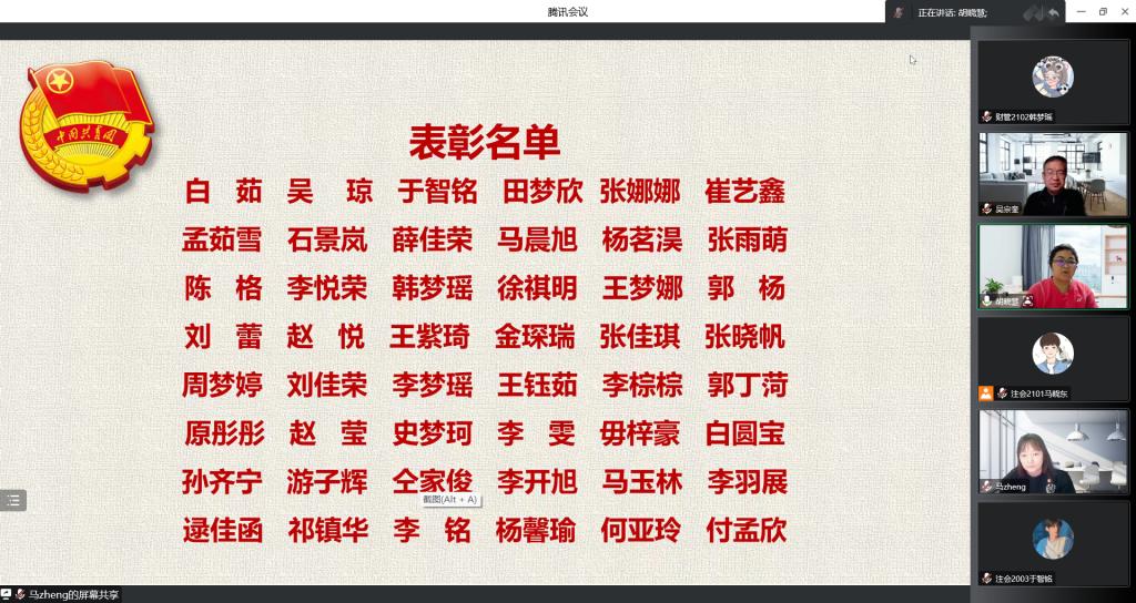 院党总支副书记胡晓慧宣读2022下半年疫情防控优秀志愿者表彰名单,充分肯定白茹、吴琼等48名学生在参与学校疫情防控、核酸检测志愿服务中所作的的贡献,号召广大青年学生以他们为榜样,勇担社会责任,锤炼实践能力,争做“有志、有才、有为、有识、有德”的“五有”青年。