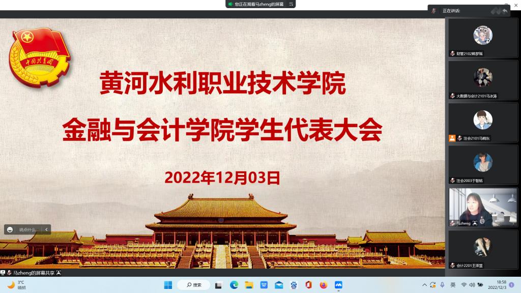 12月3日晚,金融与会计学院举行2022年学生代表大会。院党总支书记吴宗奎、党总支副书记胡晓慧、分团委书记马峥以及各年级辅导员出席了此次大会。会议由分团委书记马峥主持。
