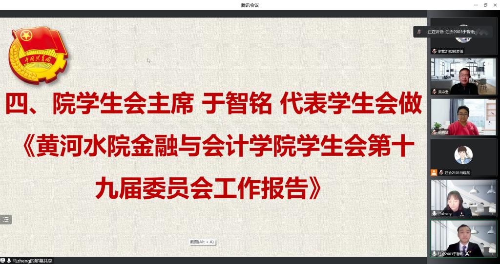 院学生会主席于智铭代表学生会做《黄河水院金融与会计学院学生会第十九届委员会工作报告》。