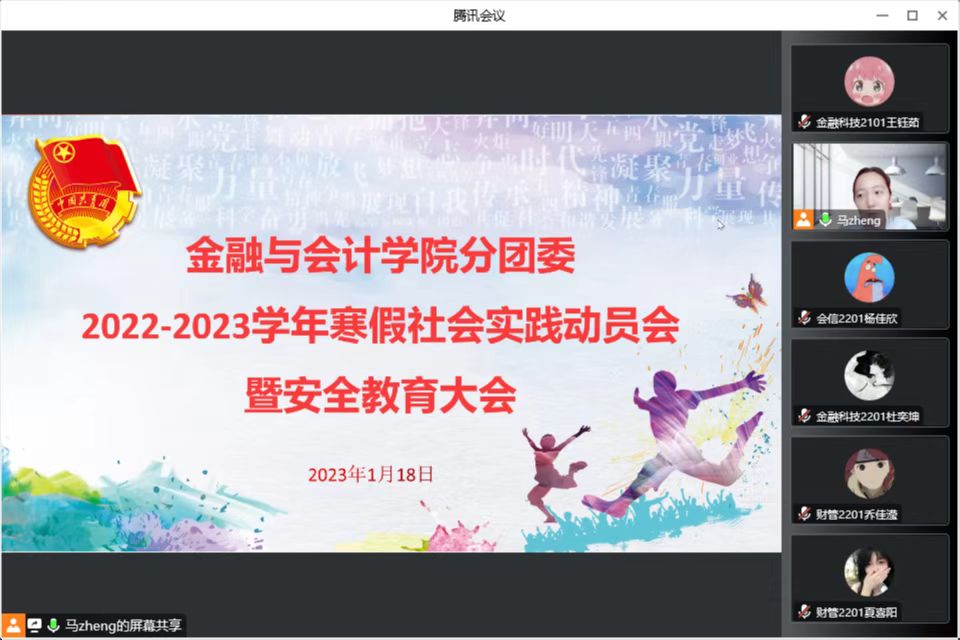 2023年1月18日,金融与会计学院分团委组织召开了2022-2023年寒假社会实践动员会暨安全教育大会,传达了本次社会实践的主题“学习二十大 永远跟党走 奋进新征程”,开展了社会实践安全教育。引导和激励广大青年学生安全有序地开展“返家乡”实习实践,在服务家乡、服务人民中进一步了解国情、感知社会。