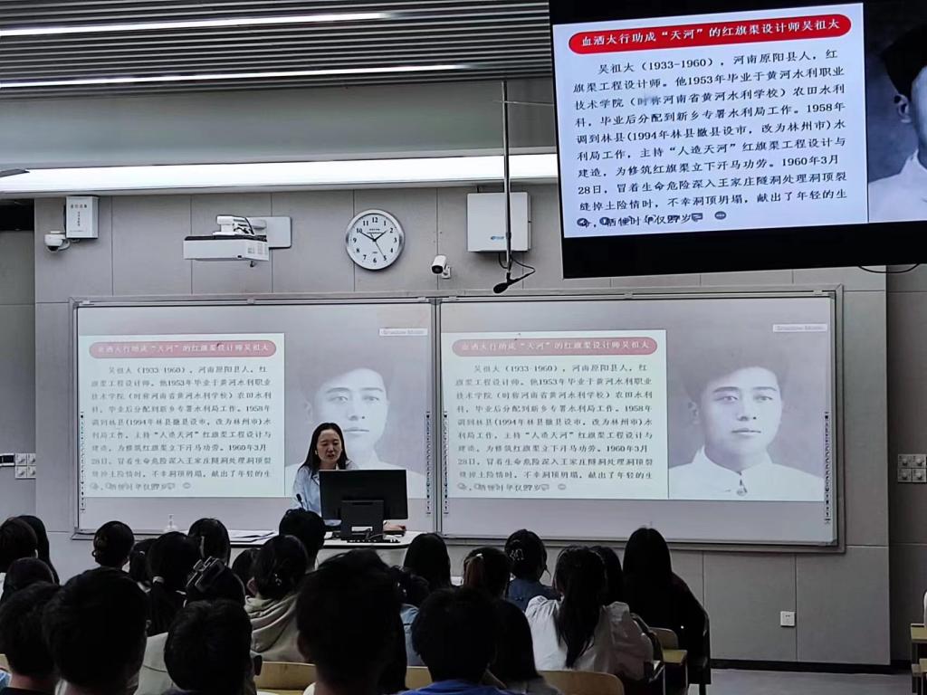 马峥领学了优秀校友吴祖太的事迹。吴祖太(曾用名吴祖泰)是河南原阳县人,红旗渠工程设计师。1953年毕业于黄河水利职业技术学院(时称河南省黄河水利学校)农田水利科,是最初参与红旗渠勘察设计与建造的工作人员。1960年3月28日,他冒着生命危险深入山西王家庄隧洞处理洞顶裂缝掉土险情时遭遇坍塌,献出了年轻的生命,年仅27岁。马峥指出,吴祖太烈士将一腔热血投身到红旗渠的设计和建设中,把人生最美好的青春年华挥洒在红旗渠上,他不怕牺牲、无私奉献的光辉事迹和高尚情操,生动诠释了红旗渠精神,犹如一面鲜红的党旗、一座精神的灯塔,激励着一代又一代黄河水院学子奋勇前进。