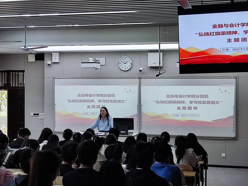 2023年5月11日中午,金融与会计学院分团委在JX2103教室召开举“弘扬红旗渠精神,学习校友吴祖太”专题团课, 2022-2023学年第二学期业余团校学员、学生干部代表参加团课学习。团课由院分团委书记马峥主讲。