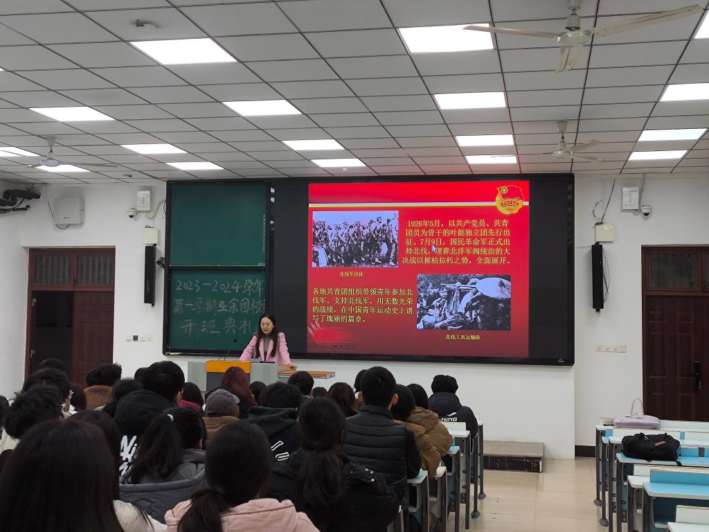 2023年11月28日中午,金融与会计学院分团委在JX6101教室召开举团情团史教育专题团课, 2023-2024学年第一学期业余团校学员、“青马工程”学员、团干部、学生干部代表团课学习。团课由院分团委书记马峥主讲。