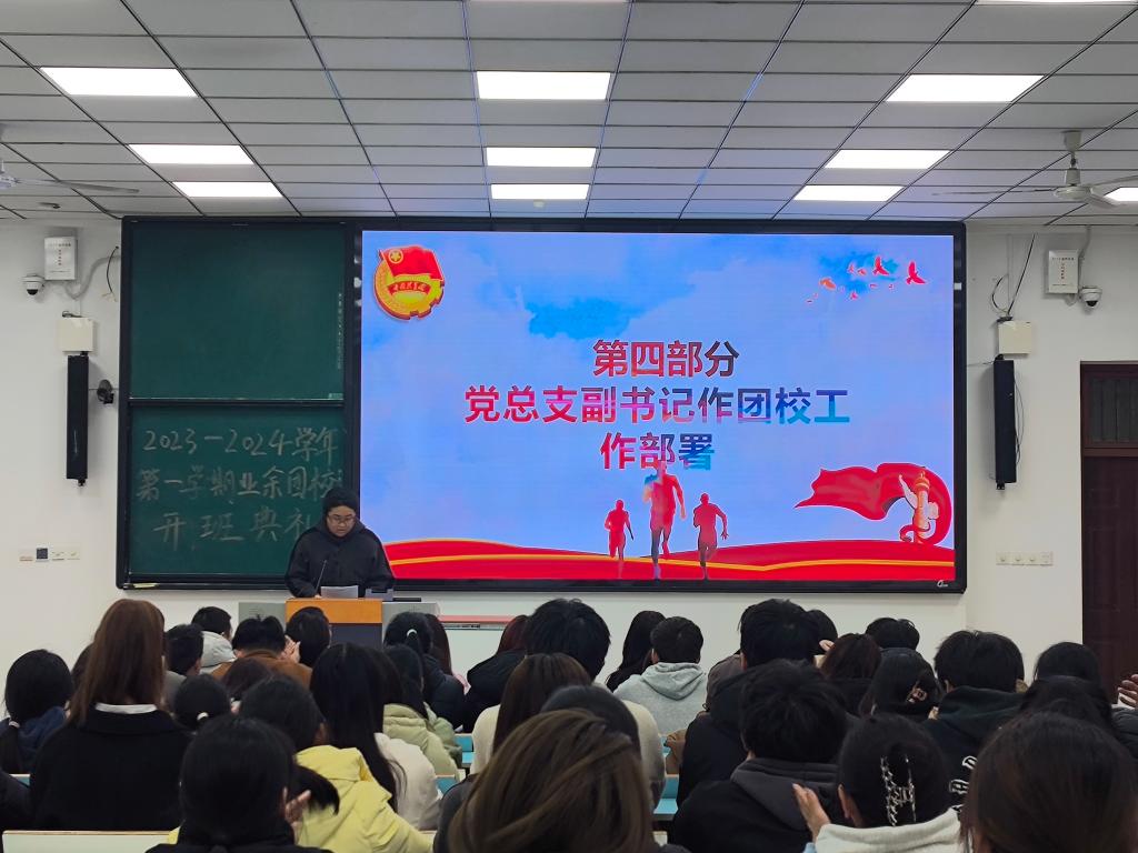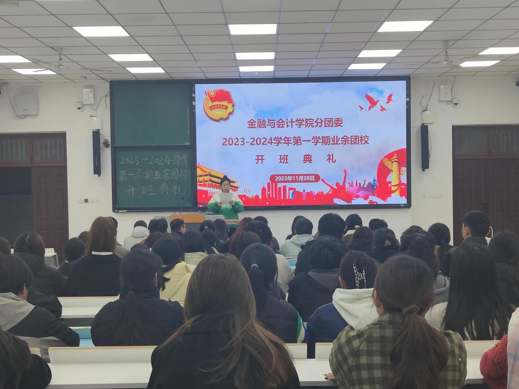 2023年11月28日中午,金融与会计学院在JX6101教室举行2023-2024学年第一学期业余团校开班典礼,院党总支副书记胡晓慧、分团委书记马峥、辅导员王歆然、徐东亚、朱命龙、李金月与52位团校学员出席会议。典礼由分团委组织部学生干部杨冲主持。