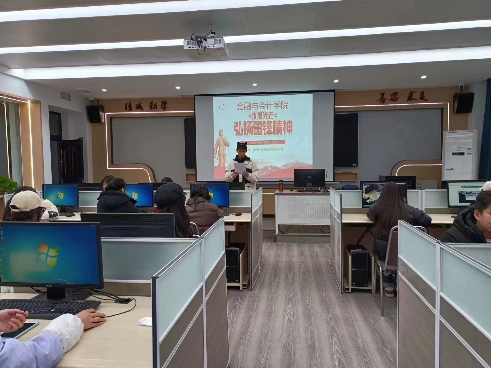 上午,金融与会计学院在SY8316实训室开展“学雷锋 促行动”学习雷锋精神宣讲会,社联分会学生干部杨佳欣、王正阳同学为大家讲述雷锋同志的先进事迹,号召全体同学行动起来,从身边的小事做起,勤奋学习,积极参与志愿服务,服务同学、服务社会,践行社会主义核心价值观,争做新时代雷锋精神的接班人。