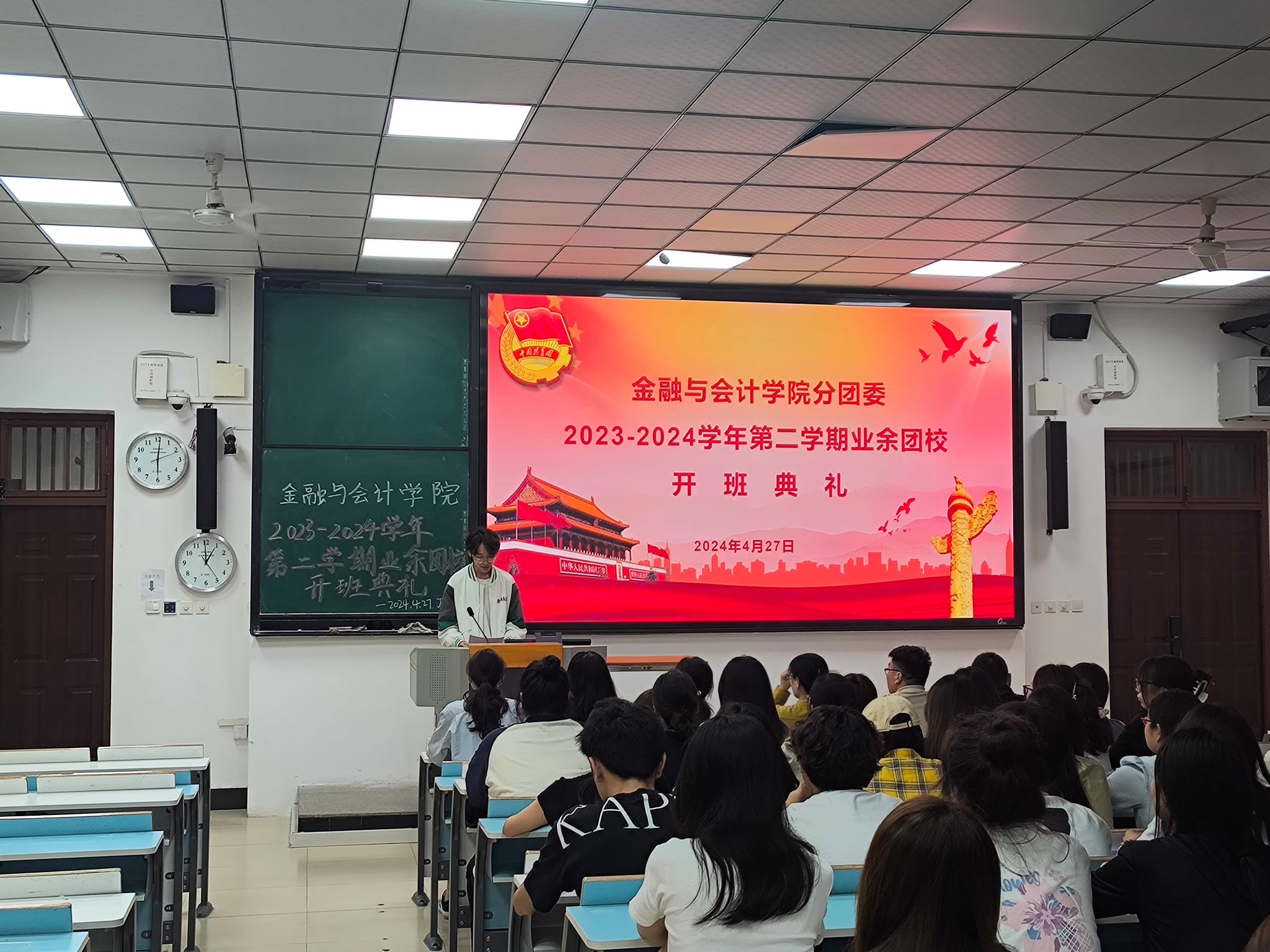 4月27日中午,金融与会计学院在JX6103教室举行2023-2024学年第二学期业余团校开班典礼,院党总支副书记霍卫红、分团委书记马峥、各年级辅导员与团校学员出席会议。典礼由分团委组织部学生干部魏家烁主持。