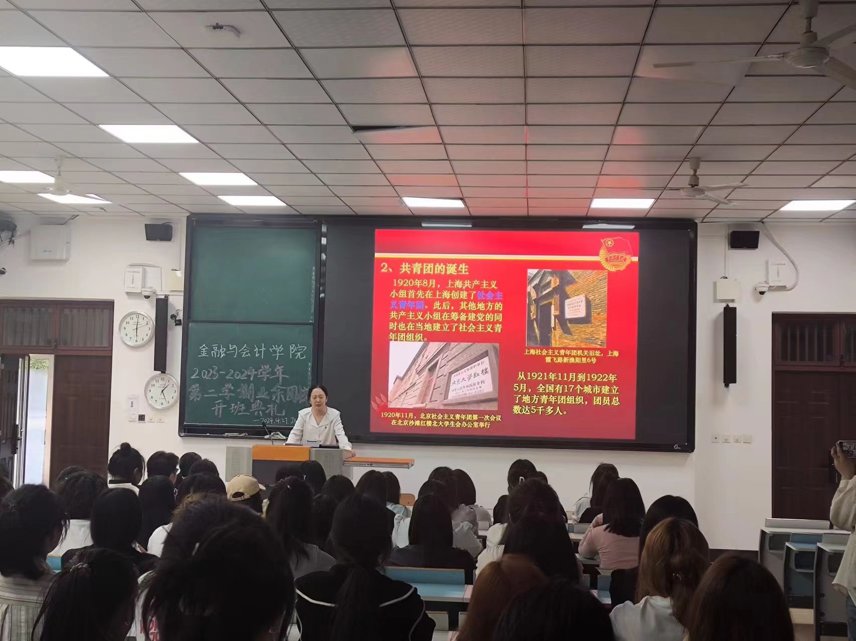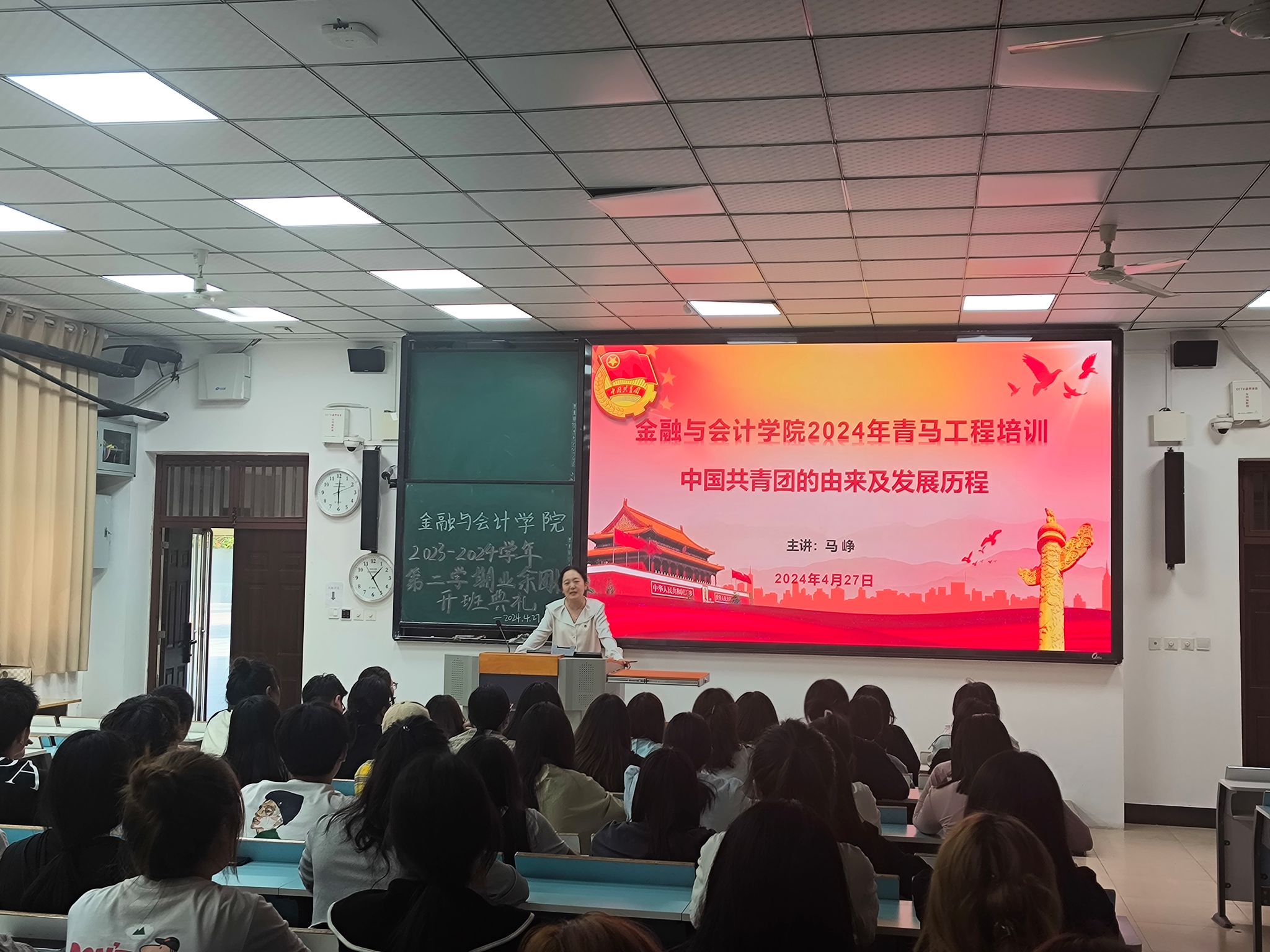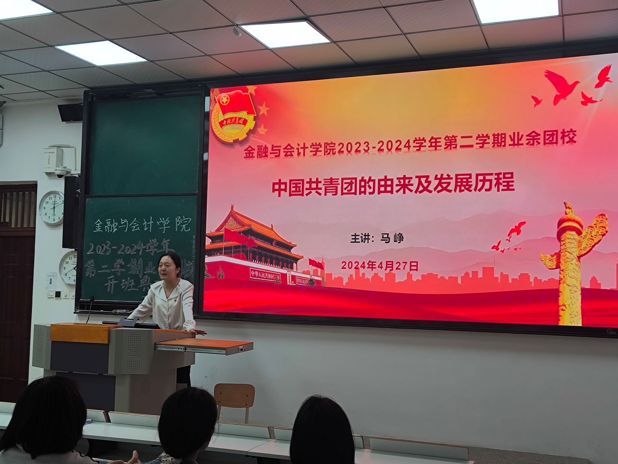 2024年4月27日下午,金融与会计学院分团委在JX6103教室开展团情团史教育专题团课暨“青马工程”培训, 2023-2024学年第二学期业余团校学员、“青马工程”学员参加。团课由分团委书记马峥主讲。