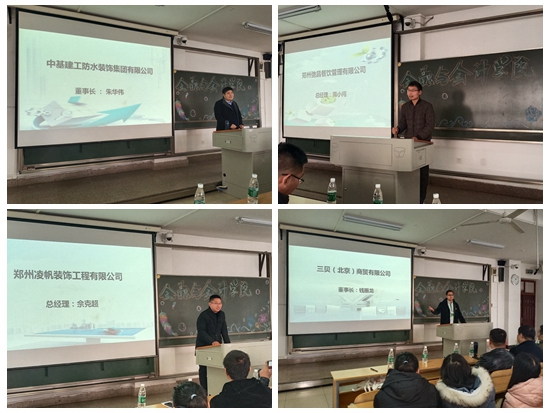为庆祝我校建校90周年,促使在校生增强创新意识,提高创业素养,12月21日下午,金融与会计学院在JX6402教室举行校庆90周年校友论坛暨创业分享会,电脑财务97级校友,现任中基建工防水装饰集团有限公司董事长朱华伟、会计(注册会计师方向)03级校友,现任三贝(北京)商贸有限公司董事长钱振龙、会计电算化06级校友,现任郑州凌帆装饰工程有限公司总经理佘克超、投资与理财05级校友,现任郑州驰昌餐饮管理有限公司总经理周小闯分别做了分享。九位优秀校友应邀参加会议,2019级两百余名学生代表聆听了分享会。分享会由院党总支书记殷莺主持。