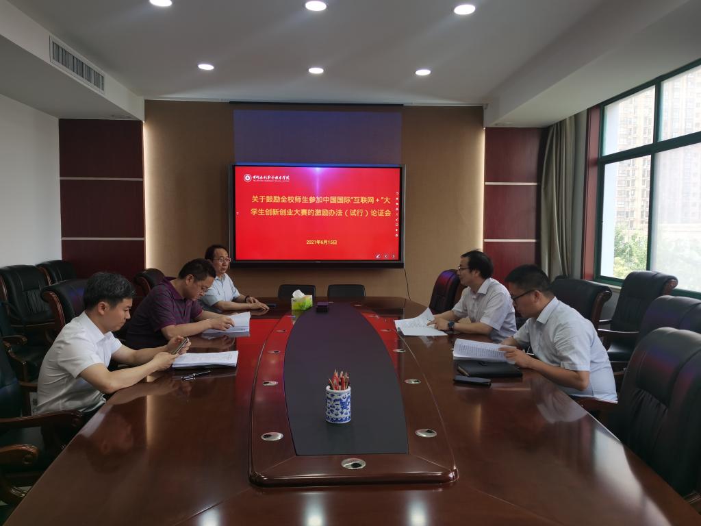 6月15日下午,我校在行政楼第二会议室召开中国国际“互联网+”创新创业大赛参赛激励办法论证会。教师工作部部长周志琦、学生工作部部长刘许亮、党政办公室副主任王忠伟、教务处副处长赵信峰参加会议。会议由创新创业学院副院长范龙主持。