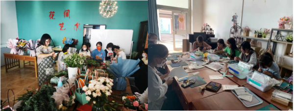 接下来,同学们在老师的指导下,学习了鲜切花处理与养护,包装纸的冲剪、花艺包装技巧、插花技巧、压花技巧等一系列花艺技能培训。既提升了学生专业技能,又激发了学生的创业活力。