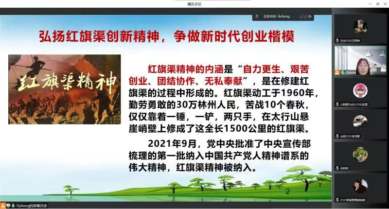 比赛伊始,院分团委书记马峥领学红旗渠精神,她指出,要紧跟习近平总书记到河南安阳林县红旗渠考察足迹,深入学习贯彻党的二十大精神,继承和发扬自力更生、艰苦创业、团结协作、无私奉献的红旗渠精神,脚踏实地、踔厉奋发,为建设中国特色社会主义现代化强国不懈奋斗。之后,依次播放21组选手的演讲视频,进行初赛评审。各组选手讲述的故事围绕红旗渠创新精神、知名企业家创业故事、高校大学生创新创业故事、学生个人创新创业实践经历等多角度选材,故事精彩纷呈,比赛如火如荼。最后,云会众创空间负责人徐莉莉老师做出点评的总结。