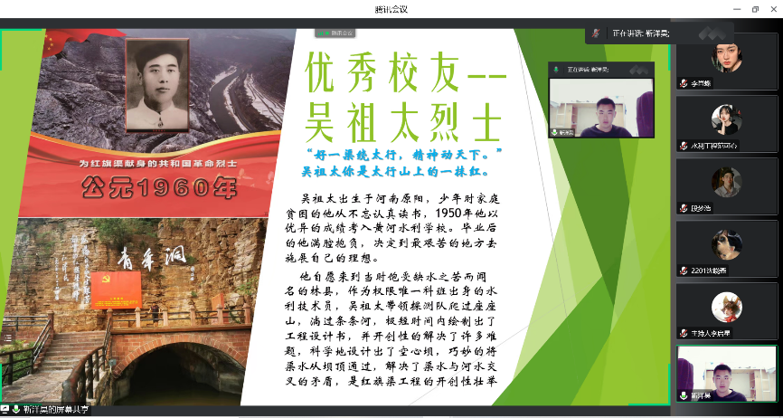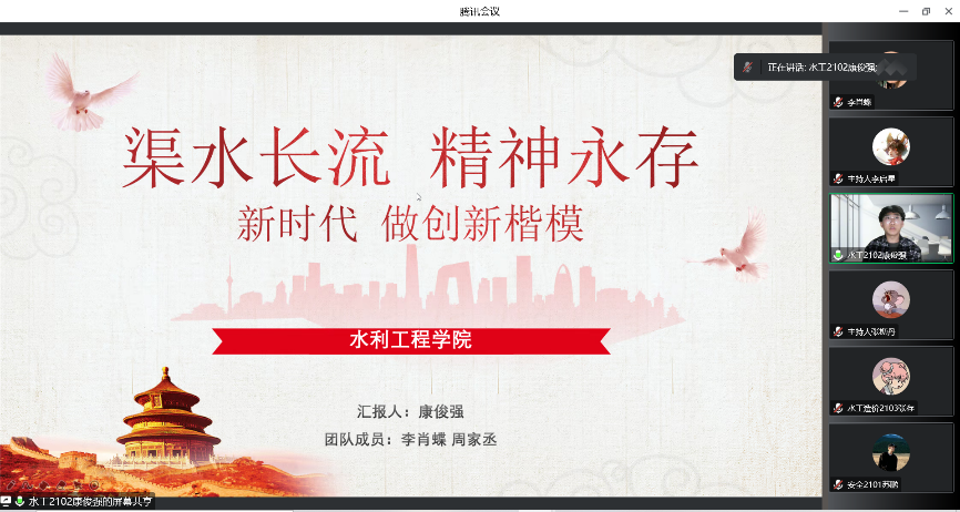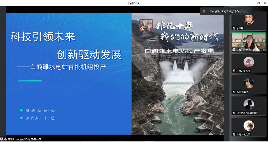 参加本次比赛的团队围绕红旗渠精神、优秀校友吴祖太、创新故事等主题,结合自身经历,利用稿件、PPT与演讲等形式,从多角度,全方位展现了新时代大学生敢于创新、勇于追梦的精神风貌。其中范可心同学以饱满的热情,全面介绍了我国水电建设的伟大成就——白鹤滩水电站。
