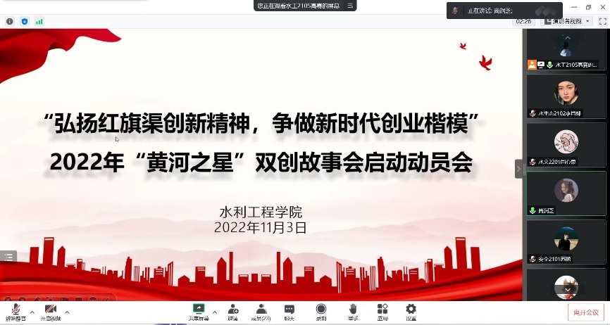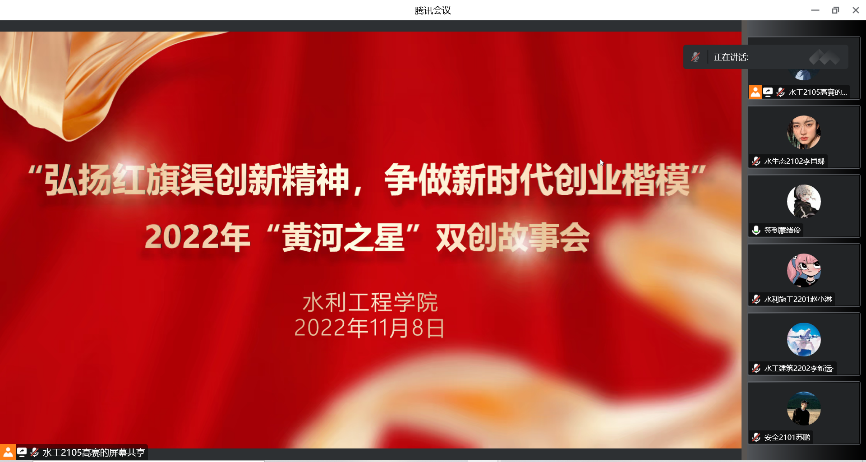 2022年11月8日,水利工程学院正式开展“黄河之星”双创故事会选拔赛,本次选拔赛由分团委组织部与分团委办公室共同主持召开,采用线上方式进行。