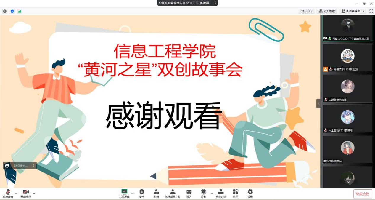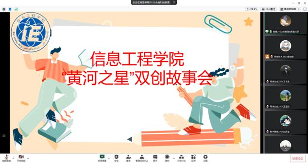 为庆祝党的二十大胜利召开,推动二十大精神落地生根,紧跟习近平总书记到河南安阳林州红旗渠考察足迹,深入学习贯彻党的二十大精神,展现我院学生创新创业新活力,信息工程学院于2022年11月7日晚上7点在腾讯会议线上举行“黄河之星”双创故事会。本次比赛由信息工程学院学生分会双创部室组织开展,21、22级同学积极参与。