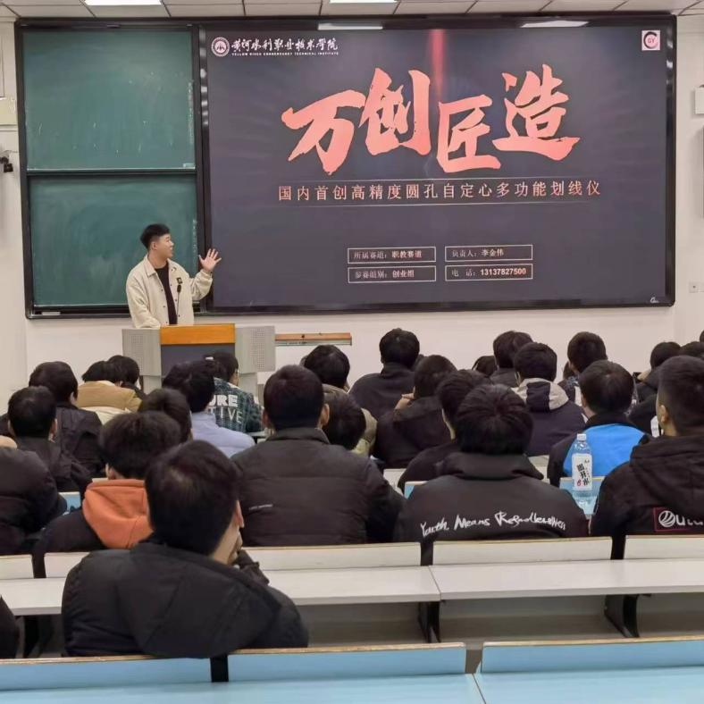 中国国际大学生创新大赛(2023)银奖获奖项目“万创匠造-国内首创高精度圆孔自定心多功能划线仪”负责人王浩同学给机械工程学院2023级、2024级数控、机制专业130名同学进行了项目分享,为学生们讲述了高精度圆孔自定心多功能划线仪产品的研制历程,经过创客空间师生不间断的技术迭代,最终打造出国内首创的便携式多功能划线仪。
