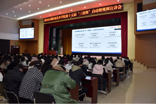 2024年12月15日下午14点30分,由黄河水利职业技术学院创新创业学院主办、商务与管理学院承办的第十五届“三创赛”(创新、创意及创业大赛)启动暨规则宣讲会,在我校学生活动中心隆重举行。本次宣讲会有商务管理学院院长吕梁主持,相关专业负责人、指导团队老师、辅导员、商务与管理学院全体在校学生以及国际教育学院相关专业的500多师生参加。本次宣讲会旨在激发在校学生的创新思维,提升创业能力,并为即将到来的大赛做好充分准备。