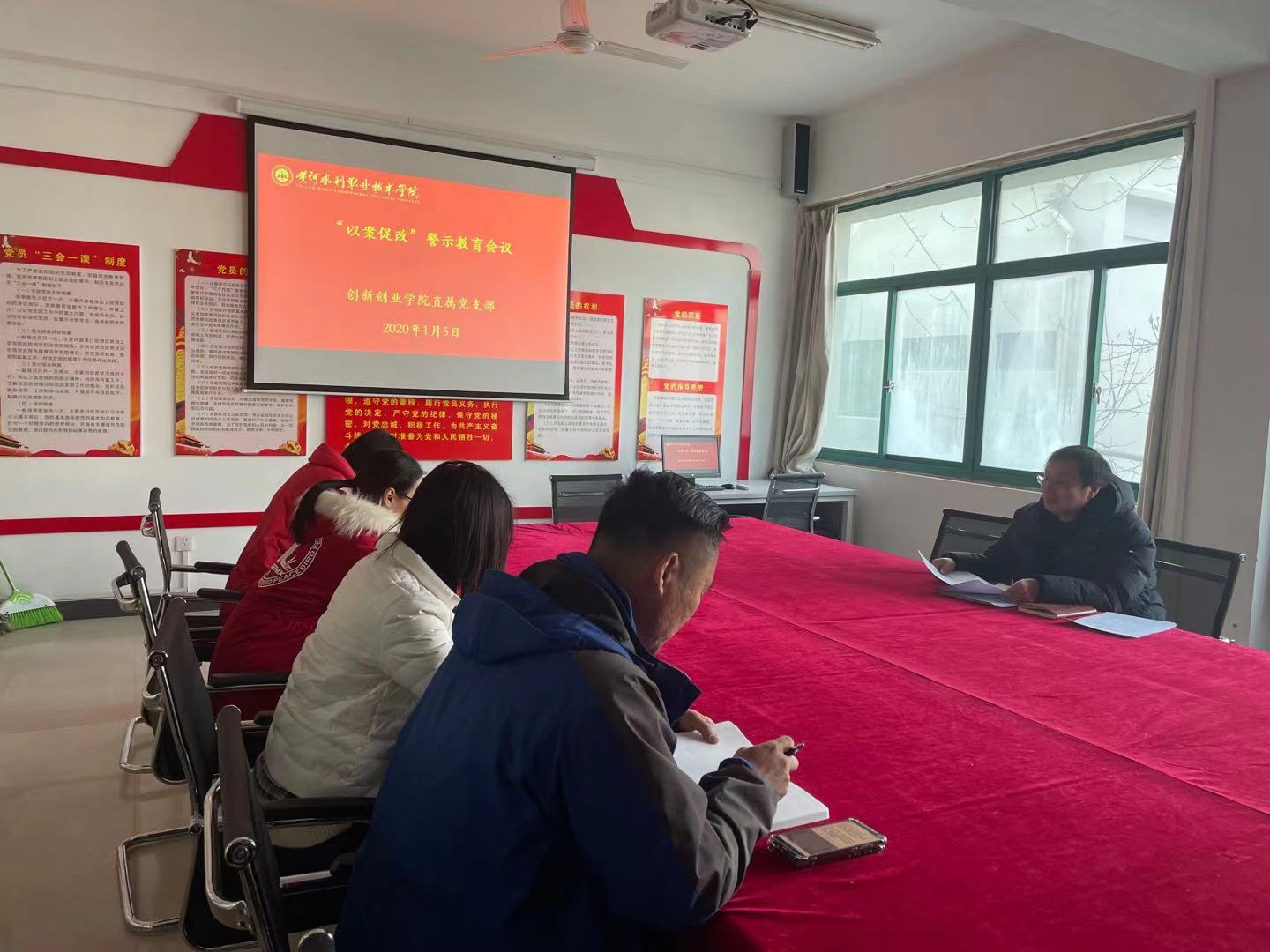 按照创新创业学院直属党支部“以案促改”工作方案,1月5日下午,创新创业学院直属党支部在三号实训楼3311党团活动室召开“以案促改”警示教育会议,会议由支部副书记范龙主持,支部全体人员参加。