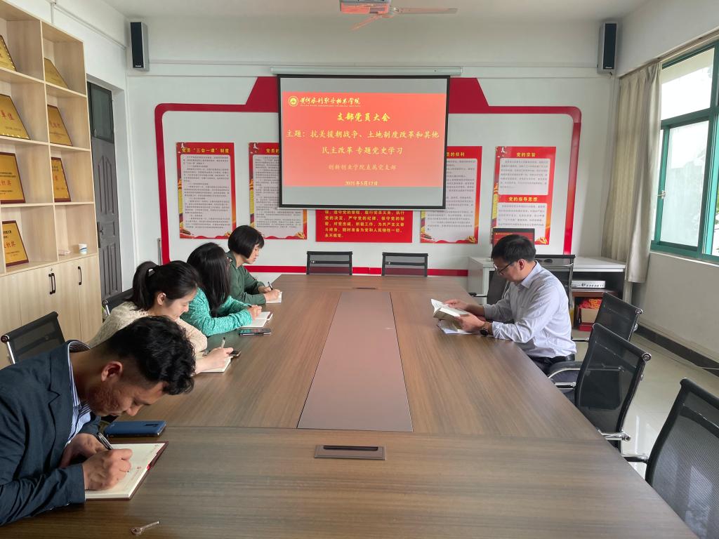 5月12日上午,创新创业学院直属党支部在SY3311召开支部党员大会,进行《抗美援朝战争、土地制度改革和其他民主改革》专题党史学习,会议由支部副书记范龙主持,支部全体成员参加。