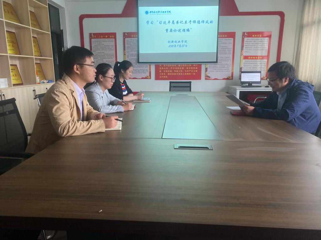 9月28日下午,创新创业学院在SY3311党员活动室召开会议,组织学习习近平总书记关于师德师风的重要论述和2021年度全国教书育人楷模先进事迹。学习活动由支部副书记范龙主持。