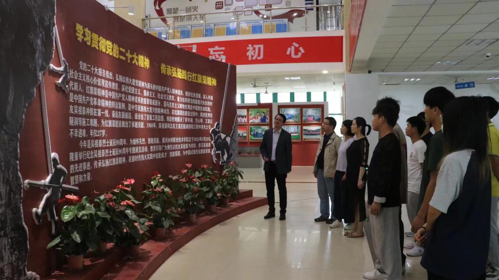 创新创业学院直属党支部书记薛冰进行了现场讲解,薛冰将历史史料与红旗渠精神传承有机结合,生动讲述了吴祖泰不畏艰险、翻山越岭、精心设计,主持设计红旗渠南谷洞大坝、人民英雄渠等主体工程,在隧洞施工排险,把青春和生命献给了红旗渠的一生。参观人员通过讲解及观摩吴祖泰成长、求学、入党、工作的图片和实物等资料,全面了解了吴祖泰青少年时期努力拼搏、奋发向上的精神风貌,深刻领会了红旗渠精神的丰富内涵和时代价值,从红旗渠精神中汲取了奋进力量。