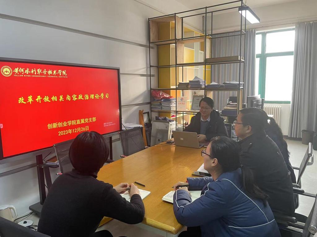 12月26日下午,创新创业学院直属党支部在SY3410办公室开展改革开放史政治理论学习,学习由直属党支部书记薛冰主持,支部全体成员参加。
