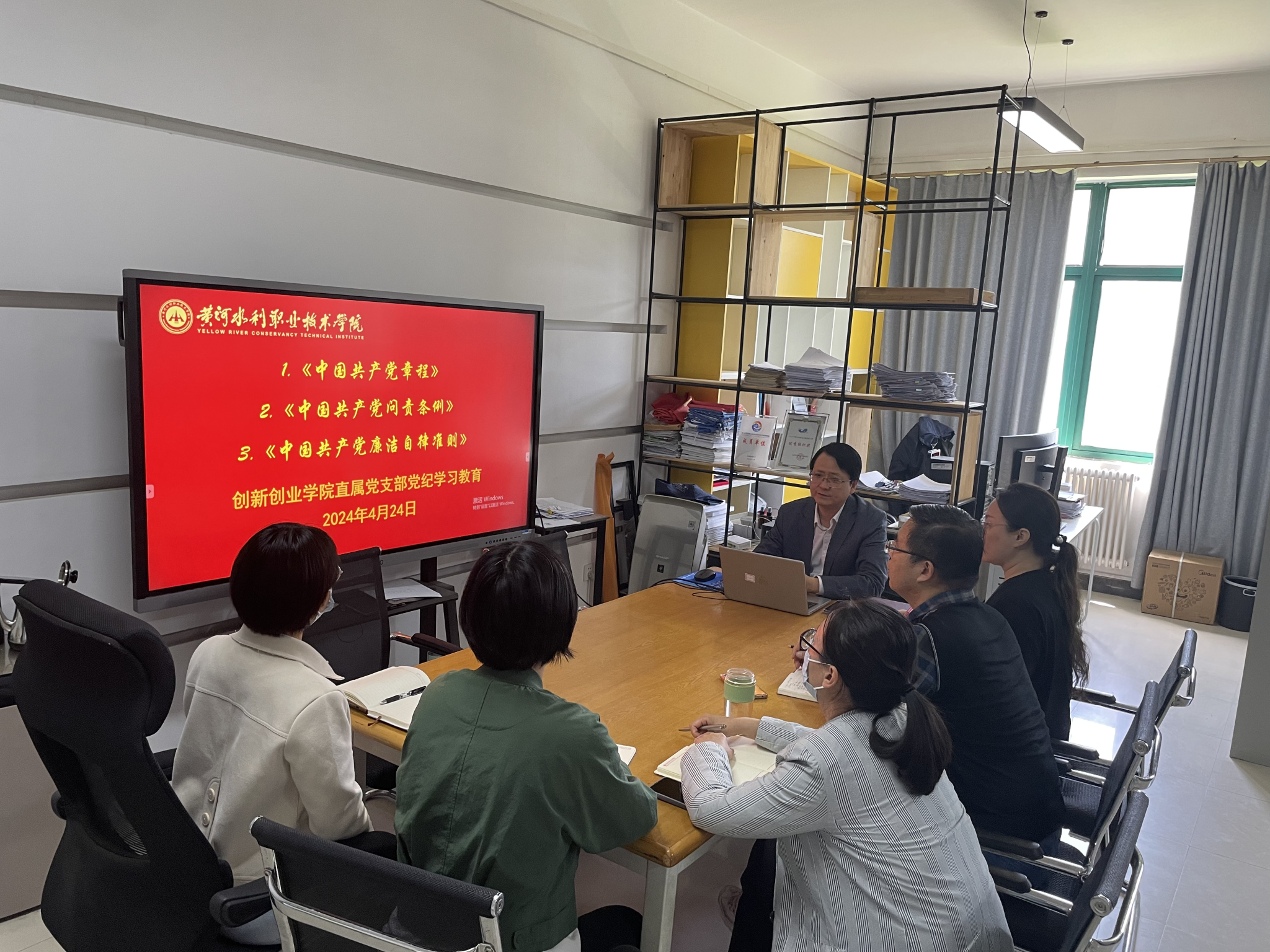 4月24日上午,创新创业学院直属党支部在SY3410开展党纪学习教育,直属党支部书记薛冰主持活动,支部全体成员参加。