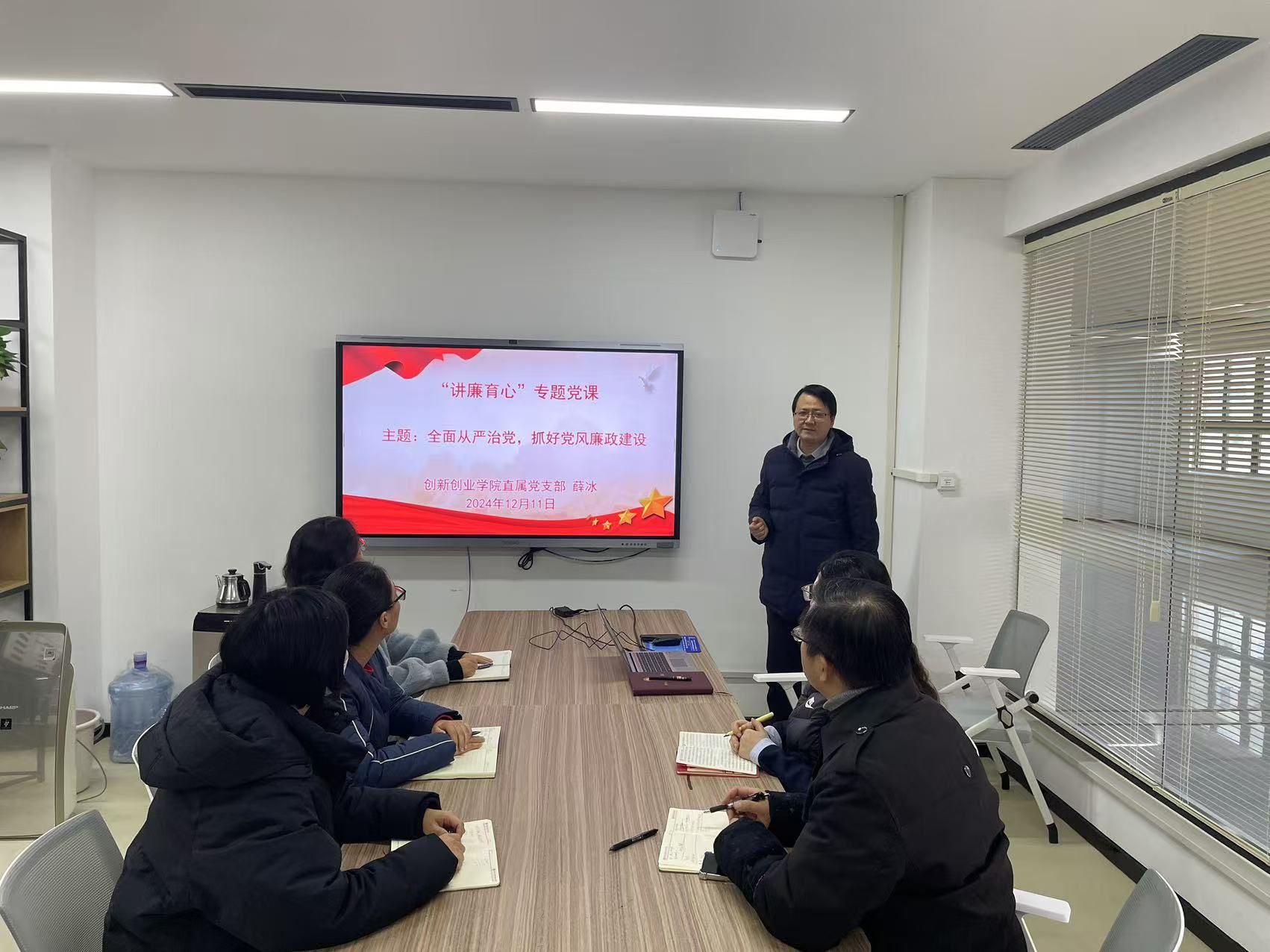 为扎实推进新时代廉洁文化建设和清廉学校创建工作,12月11日下午,创新创业学院直属党支部书记薛冰在SY7201讲授“讲廉育心”专题党课,主题为全面从严治党,抓好党风廉政建设,支部全体成员参加。