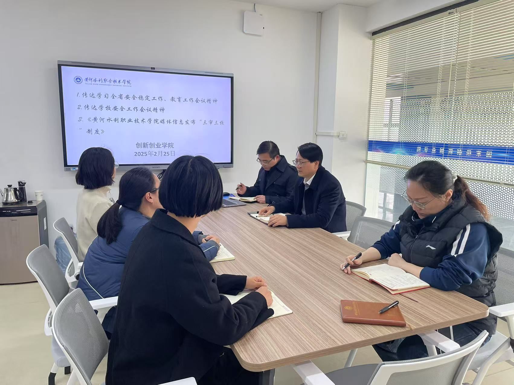 会上,薛冰带领部门成员共同学习了全省安全稳定工作、教育工作会议精神,学校安全工作会议精神以及《黄河水利职业技术学院媒体信息发布“三审三校”制度》。