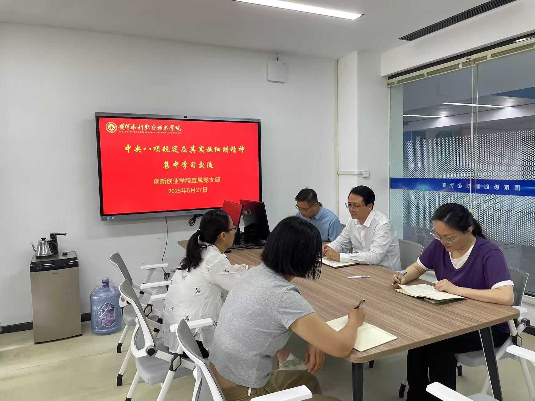 5月27日下午,创新创业学院直属党支部在SY7201开展中央八项规定及其实施细则精神集中学习研讨,会议由直属党支部书记薛冰主持,支部全体成员参加。