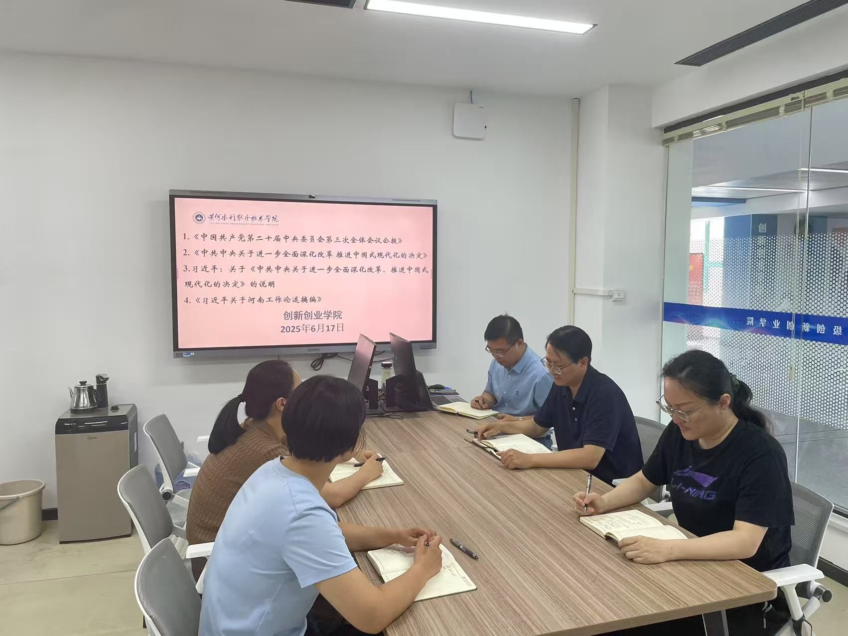 为贯彻落实校党委学习教育的部署要求,更好贯彻落实习近平总书记关于河南工作的重要讲话和重要指示批示精神,进一步提升教职工政治理论素养与思想觉悟,6月17日下午,创新创业学院在SY7201开展政治理论学习,学习由创新创业学院院长薛冰主持,部门全体成员参加。