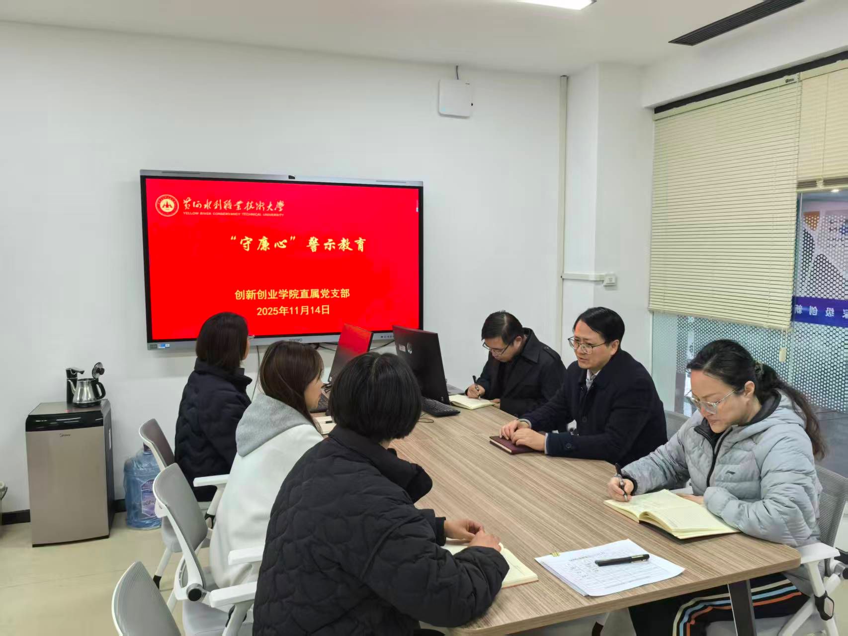 11月4日下午,创新创业学院直属党支部在SY7201开展“守廉心”警示教育活动,活动由直属党支部书记薛冰主持,支部全体成员参加。