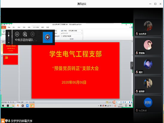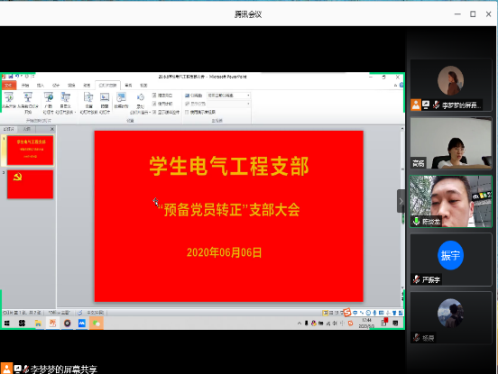 受疫情影响,学生电气工程支部预备党员转正会议召开采取了线上进行,2020年6月6日如期举行。会议开始,由支部书记聂光辉宣读活动流程,参加本次会议的有电气工程学院党总支副书记管欣,组织委员高玲,宣传委员高杨等教师党员,全体预备党员及大三全体正式党员参加了网络会议。