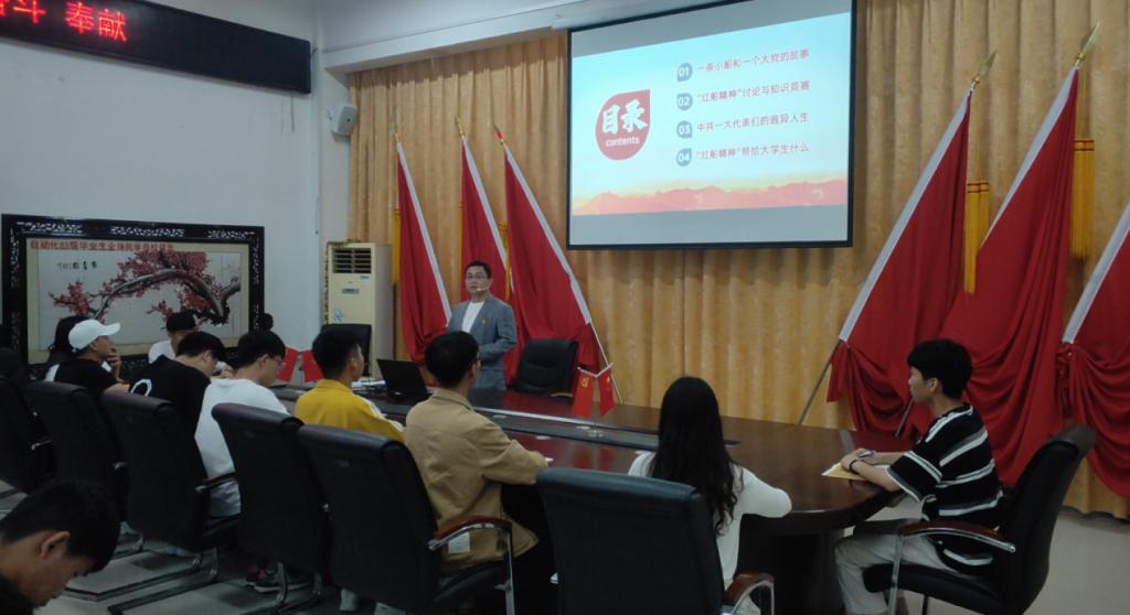 为了庆祝建党100周年,按照院党总支的要求和号召紧紧围绕“四史”学习和教育活动,讲好党史、新中国史、改革开放史和社会主义发展史,学生电气工程支部书记聂光辉经过认真学习和班会内容筛选,于2021年5月28日在党员活动室进行了党史学习教育专题之“红船精神”的授课。