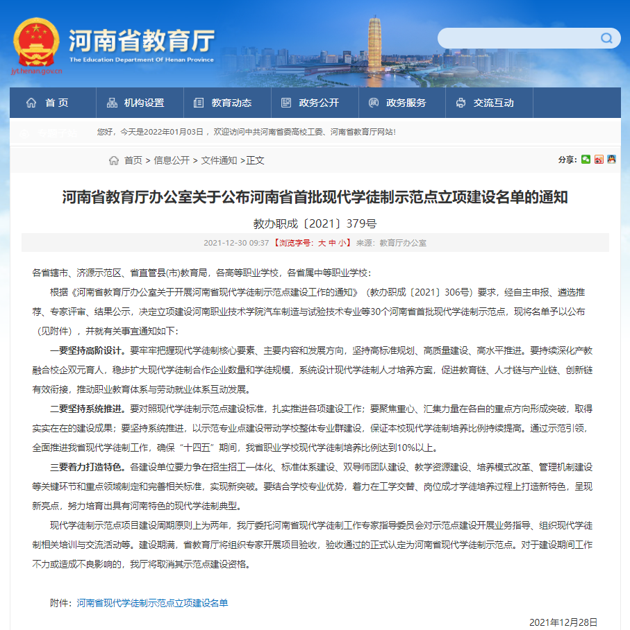 2021年12月30日,河南省教育厅发布《关于公布河南省首批现代学徒制示范点立项建设名单的通知》(教办职成〔2021〕379号),我校电子信息工程技术专业联合浙江八方电信有限公司开展的现代学徒制人才培养项目,成功入选河南省首批现代学徒制示范点立项建设名单。