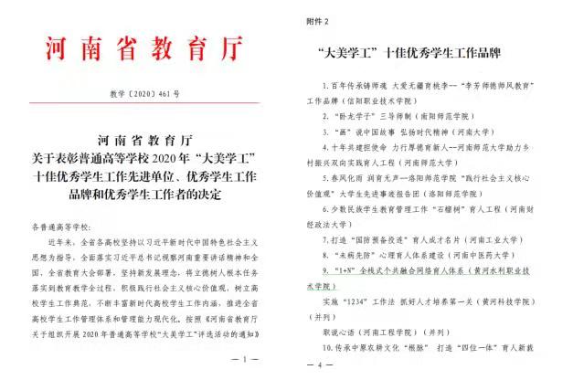 日前,河南省教育厅下发《河南省教育厅关于表彰普通高等学校2020年“大美学工”十佳优秀学生工作先进单位、优秀学生工作品牌和优秀学生工作者的决定》(教学〔2020〕461号),我校“‘1+N’全栈式个共融合网络育人体系”喜获“大美学工”十佳优秀学生工作品牌称号。