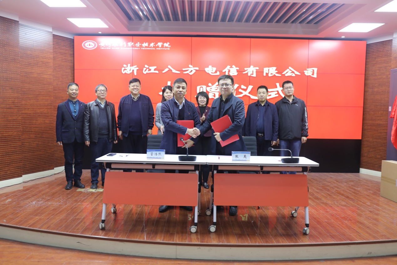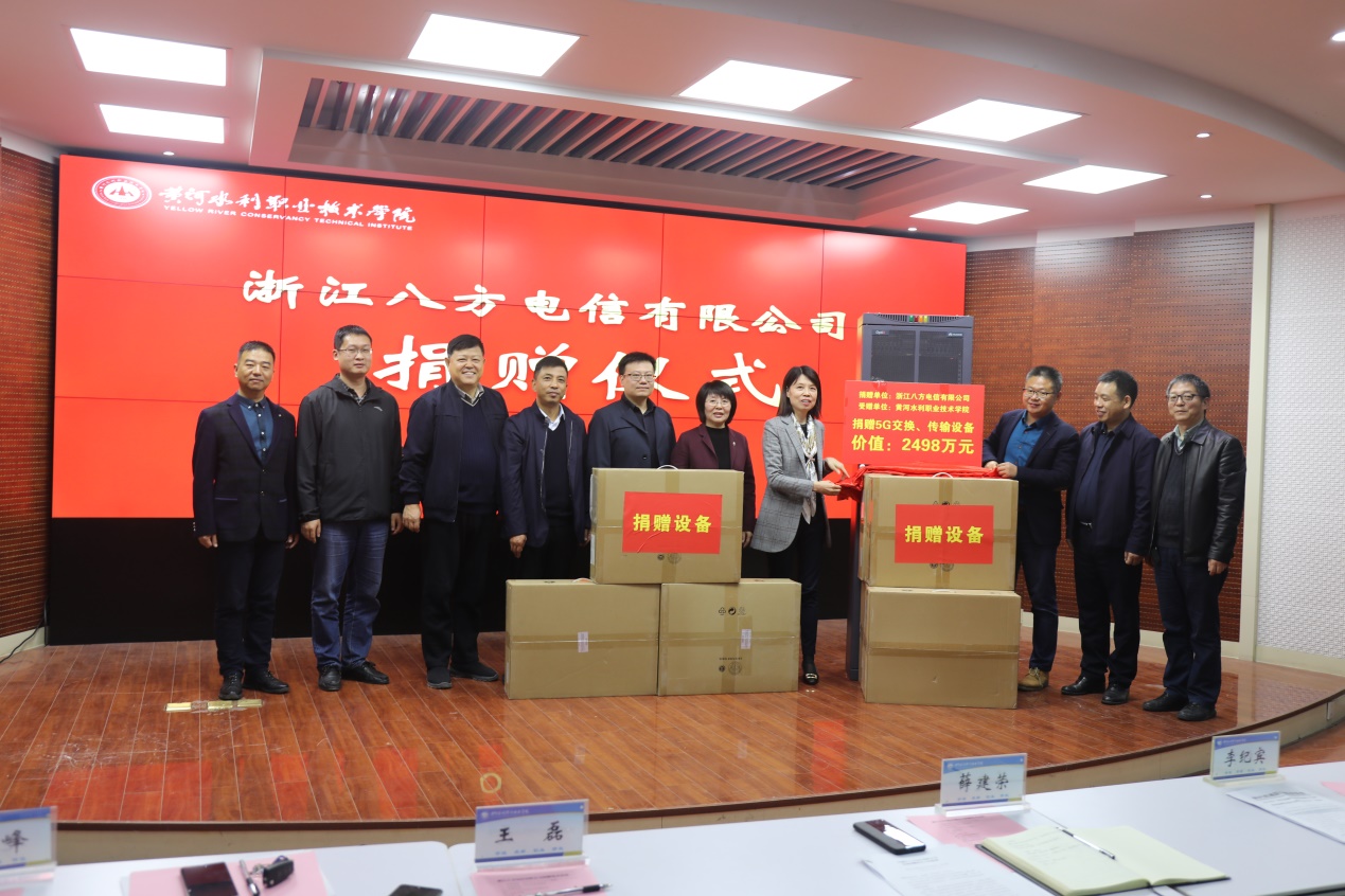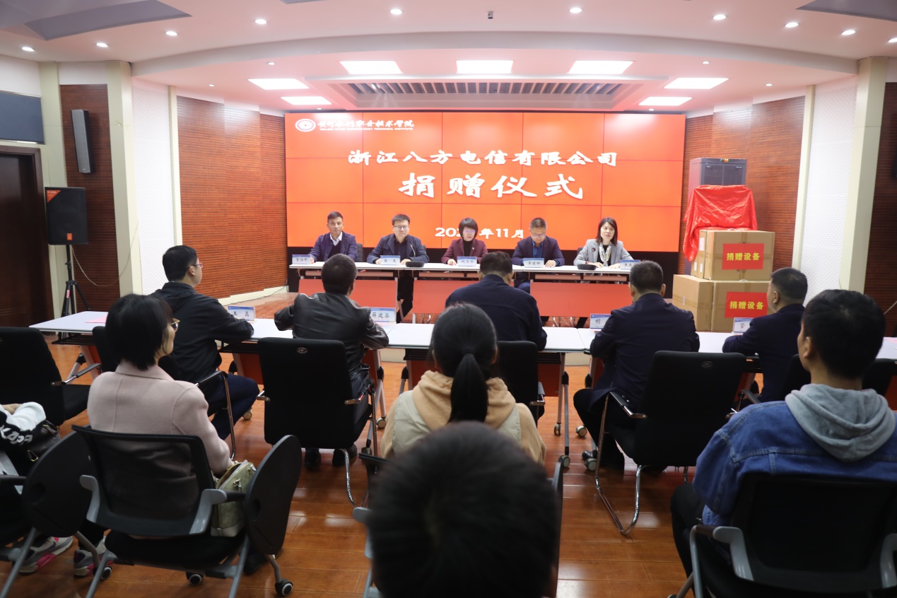 11月2日,浙江八方电信有限公司(以下简称八方电信)向我院捐赠价值2498万元的5G交换、传输设备,教学设备捐赠仪式在我校4号实训馆演播厅举行。八方电信项目总监张昊、项目经理王建柳,我校校长祝玉华,副校长焦爱萍、菅浩然出席捐赠仪式,对外联络与合作处、教务处等部门负责人及相关专业教师、2019级现代学徒制学生参会。仪式由焦爱萍主持。