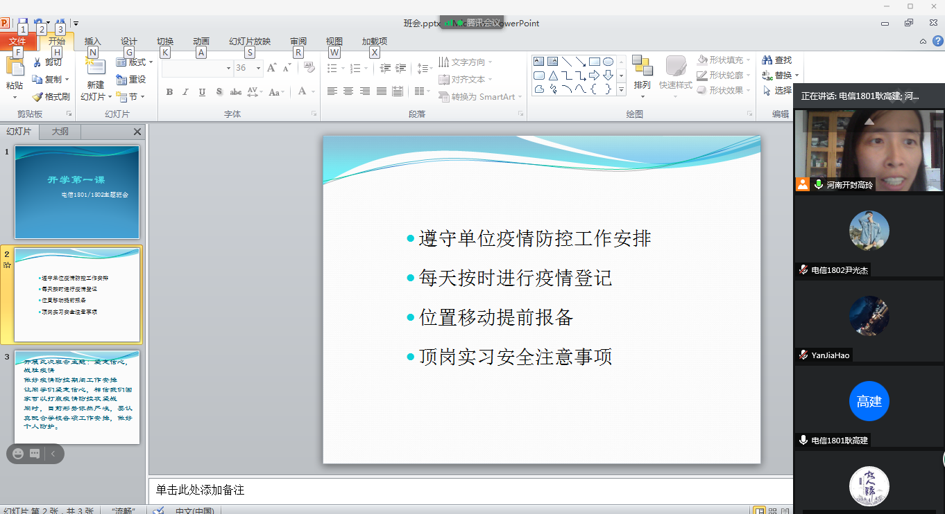 9月2日中午14:00,2018级辅导员高玲召开“开学第一课”主题班会,本次班会采用腾讯会议线上方式召开,参与对象是电信1801、1802两个班级,开展此次班会,主要传达以下事项: