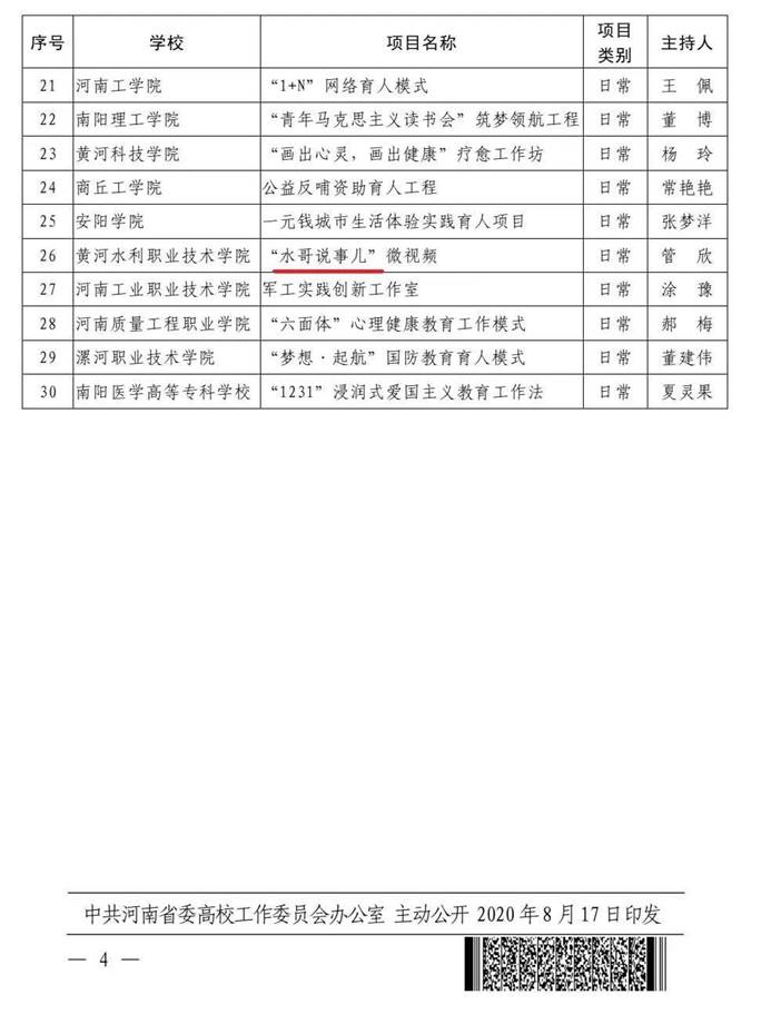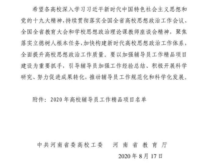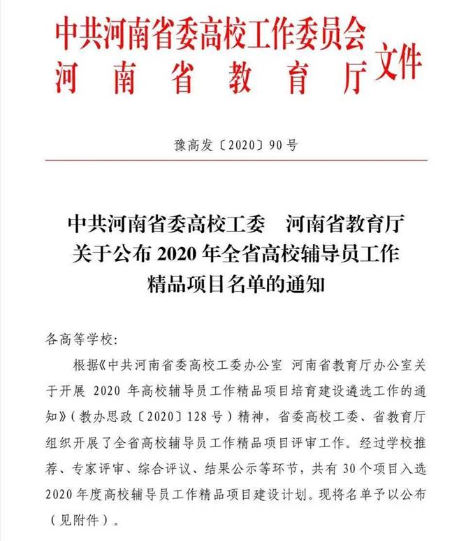 近期,中共河南省委高校工委、河南省教育厅公布了2020年高校辅导员工作精品项目评审结果,我院的网络思政特色项目“水哥说事儿”项目成果获批。