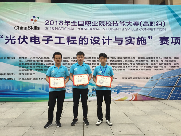 5月20日,2018年全国职业院校技能大赛“光伏电子工程的设计与实施”赛项比赛在陕西工业职业技术学院举行。经过一天的激烈角逐,由自动化工程系教师李小雄、刘金浦指导,电气1603班任宇翔和余一浩、电气1604班王思昆三名同学组成的代表队荣获团体三等奖。