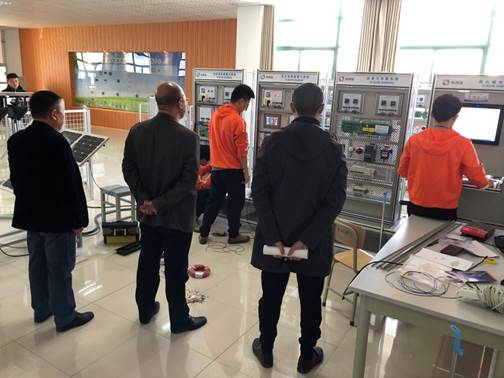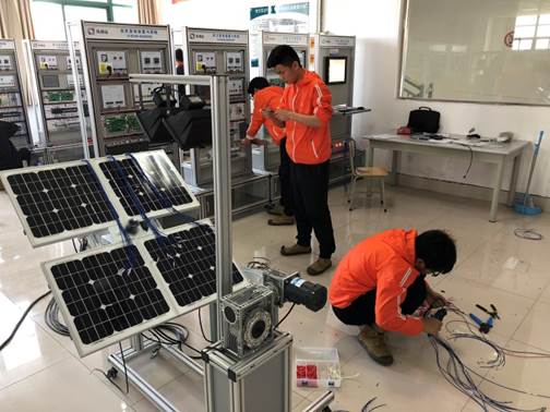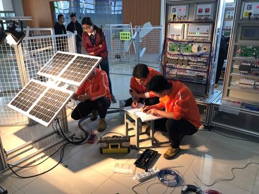 风光互补发电系统安装与调试项目是一个理论与技能相结合的综合性工程类竞赛,竞赛内容主要包括光伏发电系统、风力发电系统、逆变和负载系统、监控系统等安装与接线、编程与设计、调试与运行、仪器仪表的使用与测量、绘图与理论分析等,内容复杂繁多,由3人合作完成项目任务。在比赛中,我校代表队3名同学分别担任接线员、程序员和调试员等角色,配合默契,圆满完成了竞赛给定的所有工作任务。