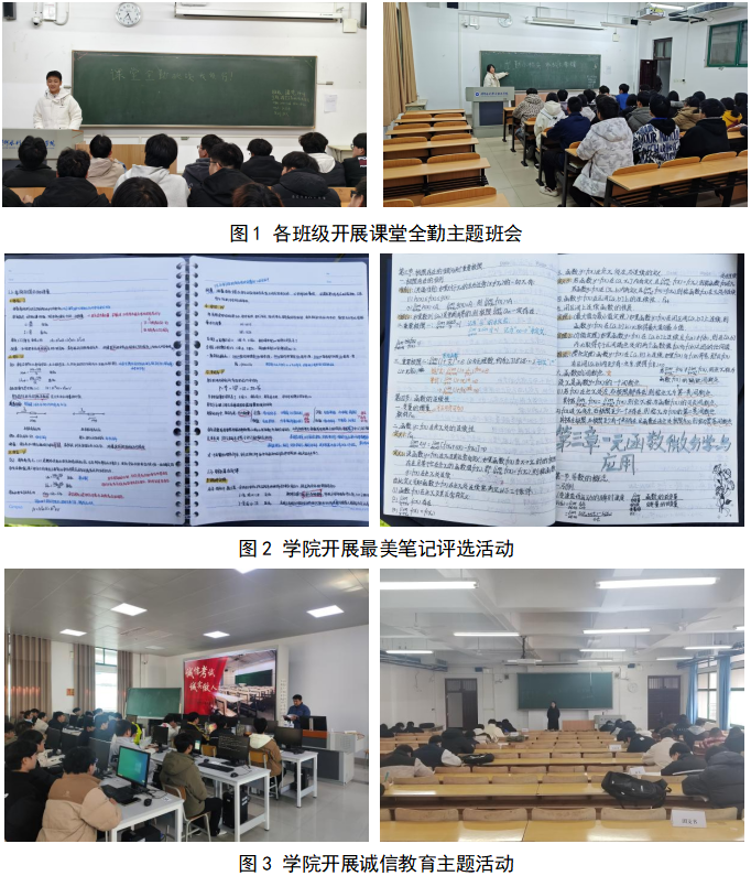 在学生课堂全勤活动中,学院通过广泛宣传和制度保障,有效提升了课堂出勤率,学生的学习热情显著增强。同时,最美笔记评选活动展示了学生的学习成果,树立了学习榜样,进一步激发了学生的学习动力。此外,学院还通过专题讲座、主题班会和诚信示范等方式,深入开展了诚信教育活动,有效加强了学生的诚信意识,遏制了考试作弊现象。